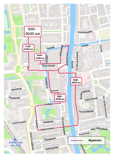 Google Maps houdt nu automatisch rekening met alle afzettingen. Als je niet de juiste datum invult, houdt Google Maps géén rekening met de afzettingen die door de organisatie van de 20 van Alphen zijn ingevoerd.